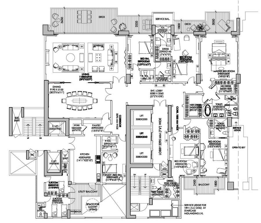 | Tentative saleable area: approx.13000 sq.ft. to 16000 sq ft.Internal lift is being provided.Master Bed Suite allows provision for separate set of toilet/dress for his and hers.Additionally, two other bedrooms have provision for separate dress for his and hers.The accommodation for the service staff has been doubled for penthouses.4 Bedrooms alongwith Living/Dining Room face the front landscaping, Linear Park and The Golf Course |